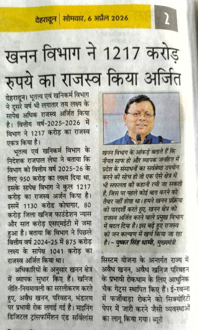 खनन विभाग ने 1217 करोड़ रूपये का राजस्व किया आर्जित।